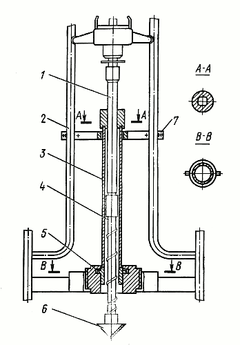 штанга бурильная, 2 - направляющие мачты, 3 - вращатель, 4 - секция шнековая, 6