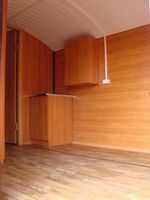 Конструкция: Каркасно-сварная металлическая основа, обшитая с внешней стороны гладким или профилированным листом, ламинированным ДСП - внутри. Окна пластиковые с двухкамерными стеклопакетами.