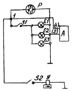 переключатель КОМ, А - сигнализатор опасного напряжения, Е1,..,Е3 - фары, S1 -