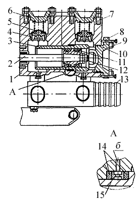 шпилька; 8 - крышка; 9 - гайка; 10 - кольцо; 11 - поршень; 12 - гайка; 13 -