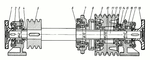 Фиксация шкивов к бортам вала производится затяжкой болтов, передающих усилия через упорные шайбы 1 и 18, фланцы, внутренние кольца шарикоподшипников 3,13,16 и втулки 4,10 и 15.