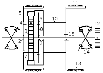 Барабан 10 лебедки с левой стороны имеет расточку, в которой запрессован зубчатый венец 6, с правой стороны - тормозной шкив 13. Зубчатый венец 6 находится в постоянном зацеплении с тремя сателлитами 1, вращающимися на шарикоподшипниках 4, установленных в гнездах тормозной шайбы 5 и водила 8. Тормозная шайба и водило скреплены между собой шестью болтами и образуют вместе с сателлитами и шарикоподшипниками отдельный блок, вращающийся на шариковых подшипниках 9 и 2 на валу 15. Сателлиты, сцепляясь с венцом 6, находятся одновременно в зацеплении с солнечной шестерней 3.