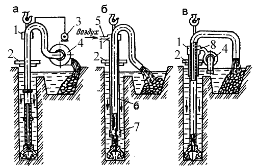 воздуха, 6 - двойная колонна труб: 7 - смеситель эрлифта; 8 – эжектор.