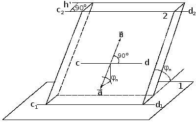 Рис. 3.2. Элементы залегания пласта: 1 — горизонтальная плоскость; 2 — плоскость наслоения; ā — вектор линии падения; b — вектор линии восстания; cd, c1d1, c2d2 — линии простирания; φп — угол падения; h1 — мощность пласта.