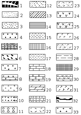 Рис. 3.1. Штриховые условные обозначения горных пород: 1 — торф; 2 — песок мелкозернистый; 3 — песок среднезернистый; 4 — песок крупнозернистый; 5 — песчаник; 6 — гравий; 7 — галечник; 8 — конгломерат; 9 — кремнистые породы (яшмы, опоки, диатомиты); 10 — щебень; 11 — валуны; 12 — супесь; 13 — суглинок; 14 — аргиллит; 15 — глина; 16 — лессовидный суглинок; 17 — лесс; 18 — известняк; 19, 20 — доломит; 20, 21 — мергель; 22, 23 — породы кислого состава, соответственно: лавы, туфы; 24, 25 — породы среднего состава, соответственно: лавы, туфы; 26, 27 — породы основного состава, соответственно: лавы, туфы; 28 — глинистый сланец; 29 — мел; 30 — гипс; 9, 31 — опоки; 32 — каменный уголь; 33 — граниты и другие скальные породы.