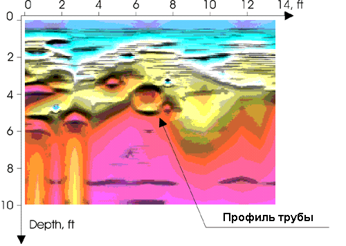Метод РАП может успешно применяться для поиска подземных инженерных коммуникаций: трубопроводов, фундаментов, туннелей и т.п. Результаты работ на одном из объектов (см.рисунок) подтвердили высокую эффективность метода для решения подобных задач.