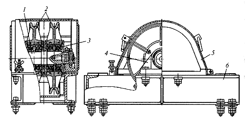 Кронблок (рис. 4.20) является неподвижной частью талевой системы, монтируется на верхней раме мачты или на подкронблочных балках вышки. Представляет собой раму б, сваренную из профильного проката, на которой в опорах размещена ось 1 со шкивом 2 установленные на подшипниках качения 3.