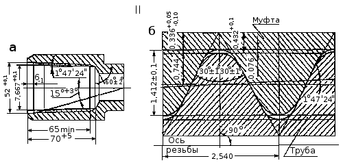 размеры резьбы муфты: а - размеры; б — профиль резьбы.